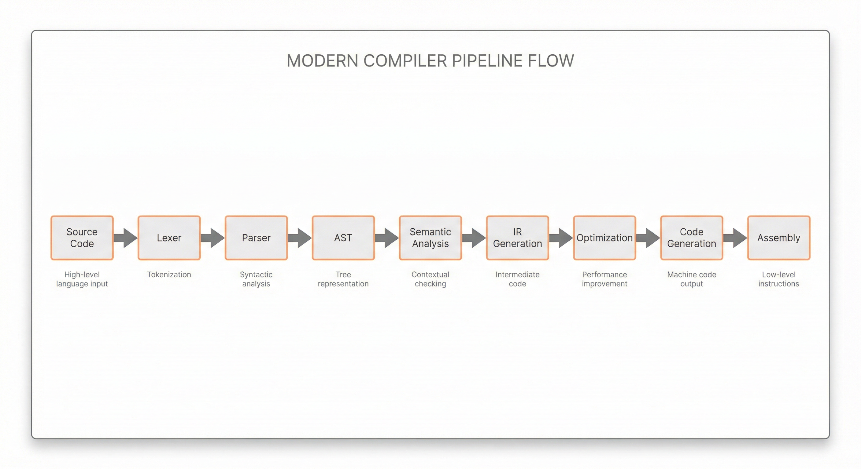 A fully-featured compiler for a subset of C, implementing the complete compilation pipeline from source code to x86 assembly. Built as part of graduate coursework to understand compiler construction fundamentals.